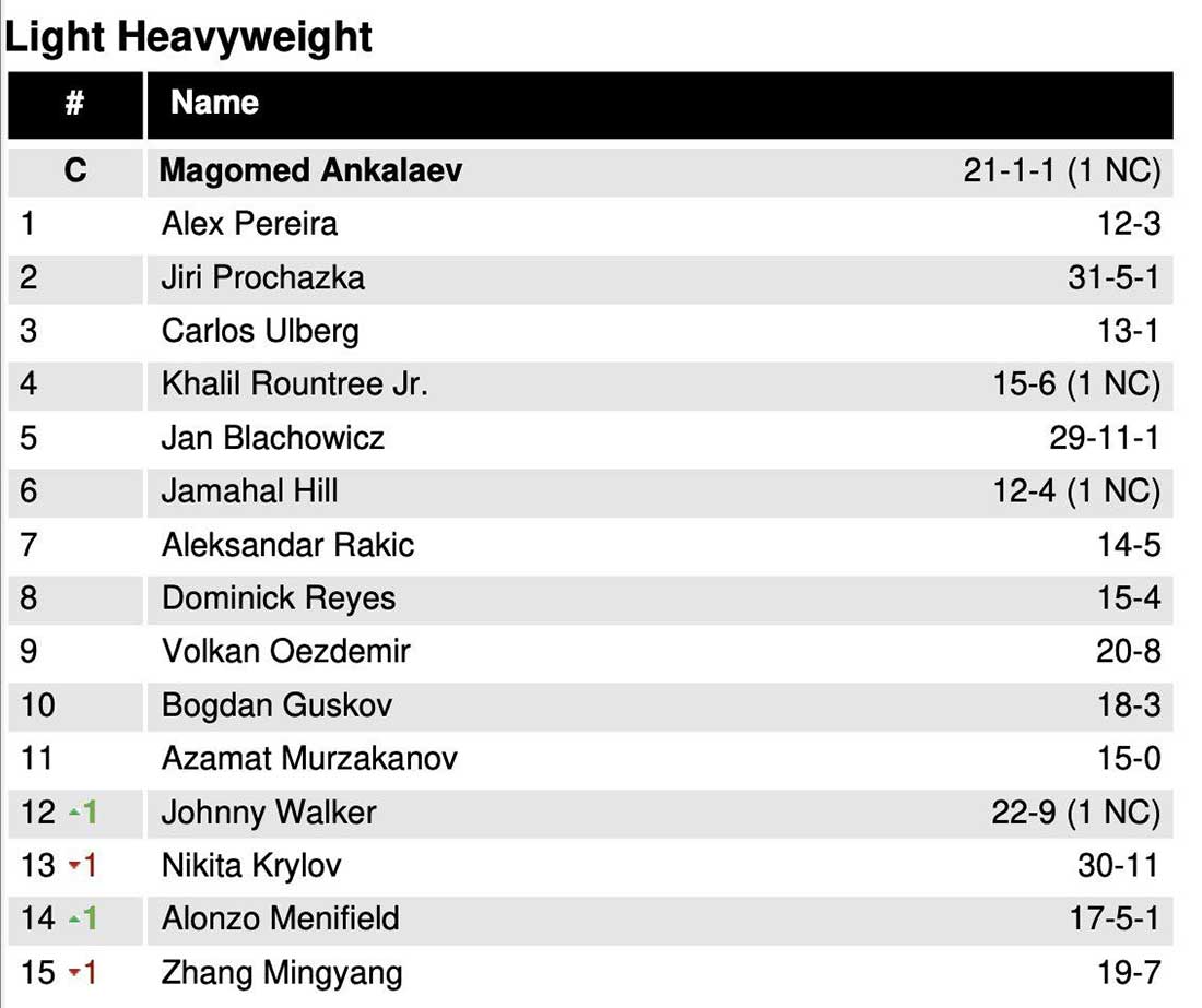 Бразильский полутяжеловес Джонни Уокер, в главном поединке турнира неожиданно победивший техническим нокаутом Миньяна Чжана, поднялся на одну строчку в дивизионе, сместив с двенадцатого места россиянина Никиту Крылова. Китайский боец опустился с четырнадцатой позиции на пятнадцатую, пропустив вперед Алонзо Менифилда.