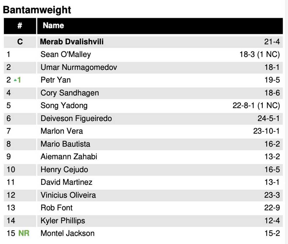 Титульный бой в легчайшем весе между Мерабом Двалишвили и Кори Сэндхагеном, в котором грузинский боец одержал доминирующую победу единогласным судейским решением, никак не повлиял на положение бойцов в рейтинге организации. Чемпион остался на третьей строчке в списке лучших бойцов вне зависимости от веса, а американец сохранил за собой четвёртую строчку в рейтинге дивизиона. С третьего на второе место переместился россиянин Пётр Ян, который теперь делит данную позицию со своим соотечественником Умаром Нурмагомедовым.