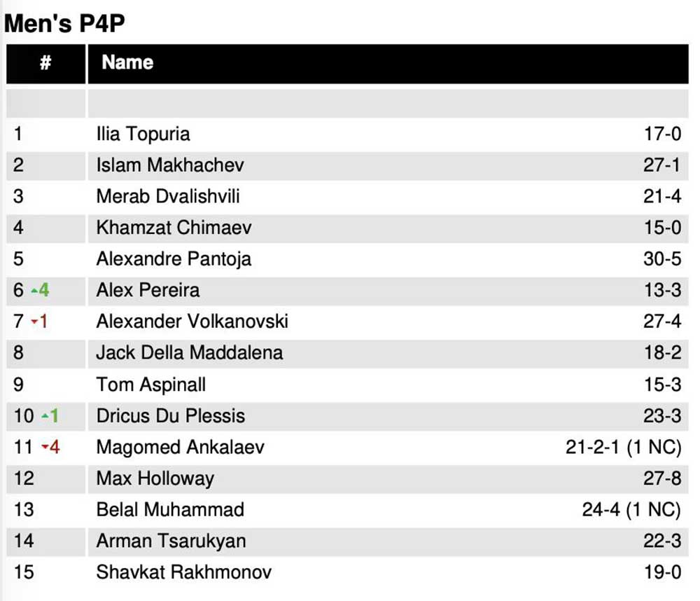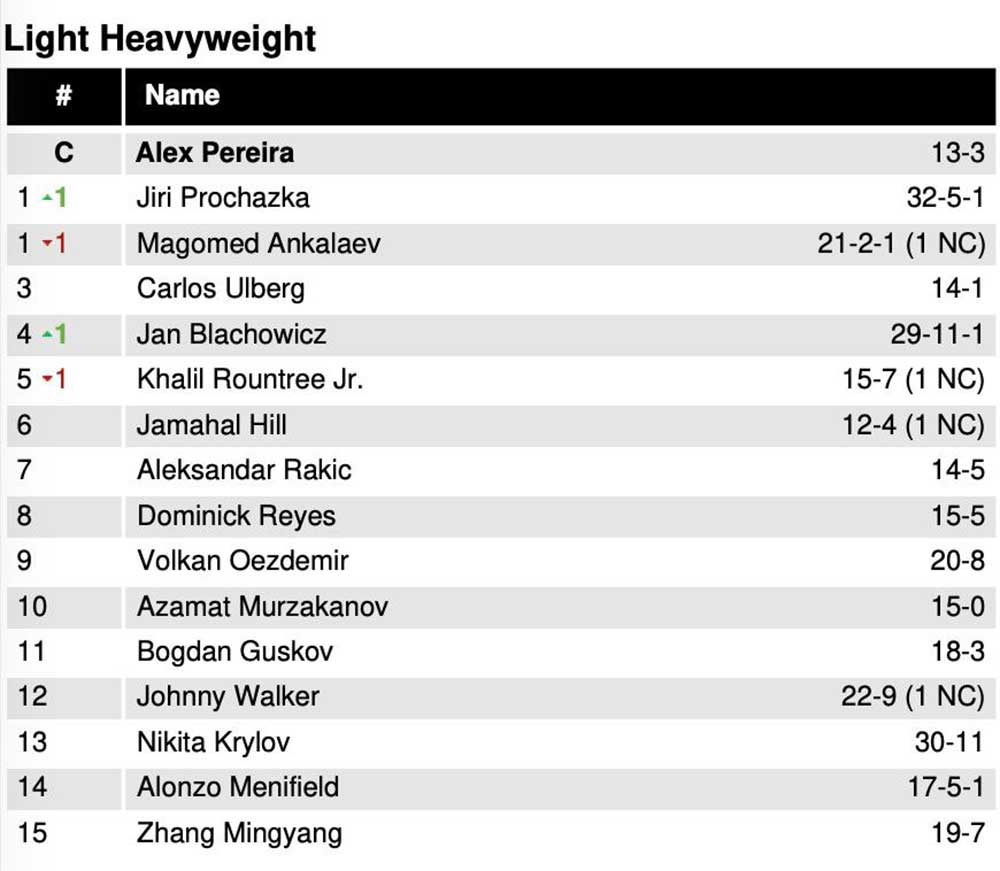 Одержав досрочную победу в реванше над Магомедом Анкалаевым, Алекс Перейра не только вернул себе чемпионский пояс UFC в полутяжёлом весе, но и поднялся на четыре позиции в рейтинге лучших бойцов организации вне зависимости от весовой категории, заняв в нём шестое место.