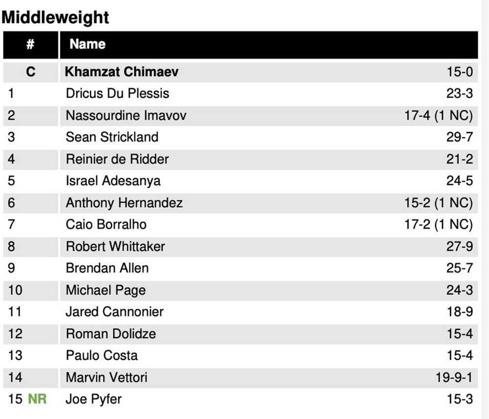 Американец Джо Пайфер, досрочно победивший Абусупияна Магомедова, вошёл в топ-15 рейтинга средневесов UFC, вытеснив с пятнадцатой строчки россиянина Икрама Алискерова.