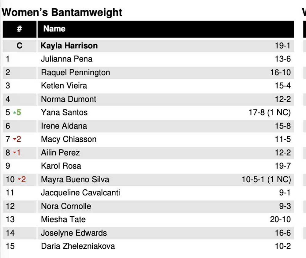 Также существенно улучшила свои позиции россиянка Яна Сантос, которая победила единогласным судейским решением американку Мэйси Чиассон и поднялась на пять позиций в рейтинге женского легчайшего веса, замкнув топовую пятёрку дивизиона.