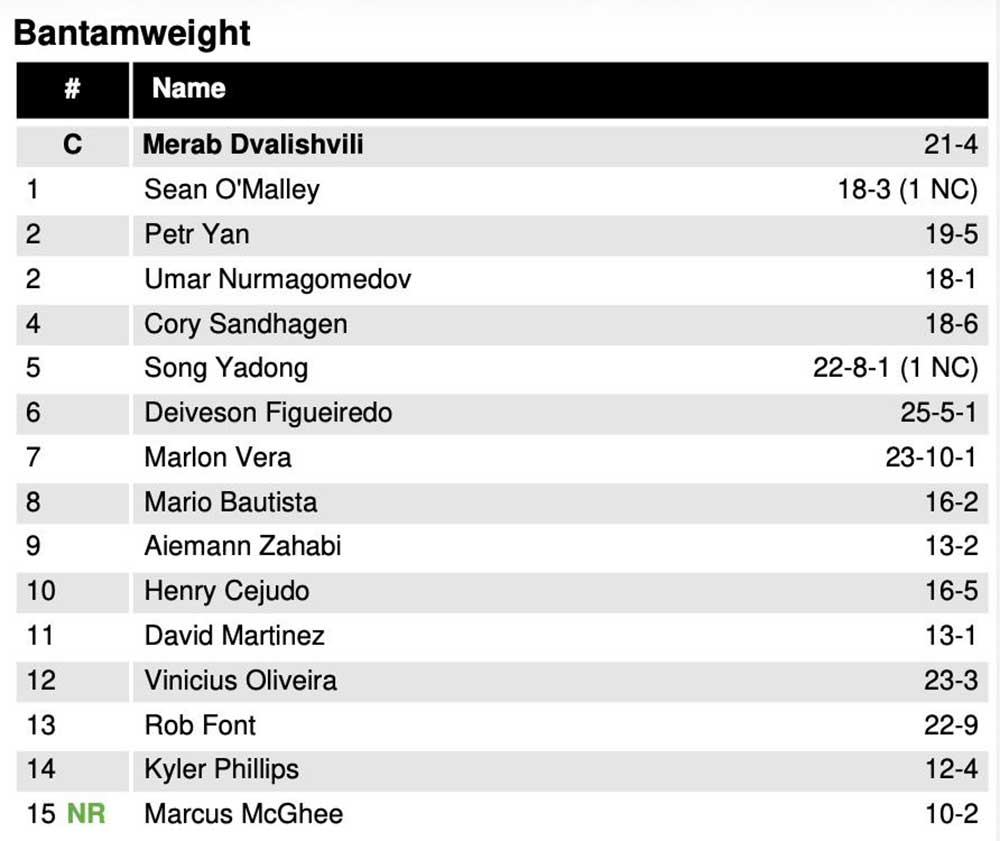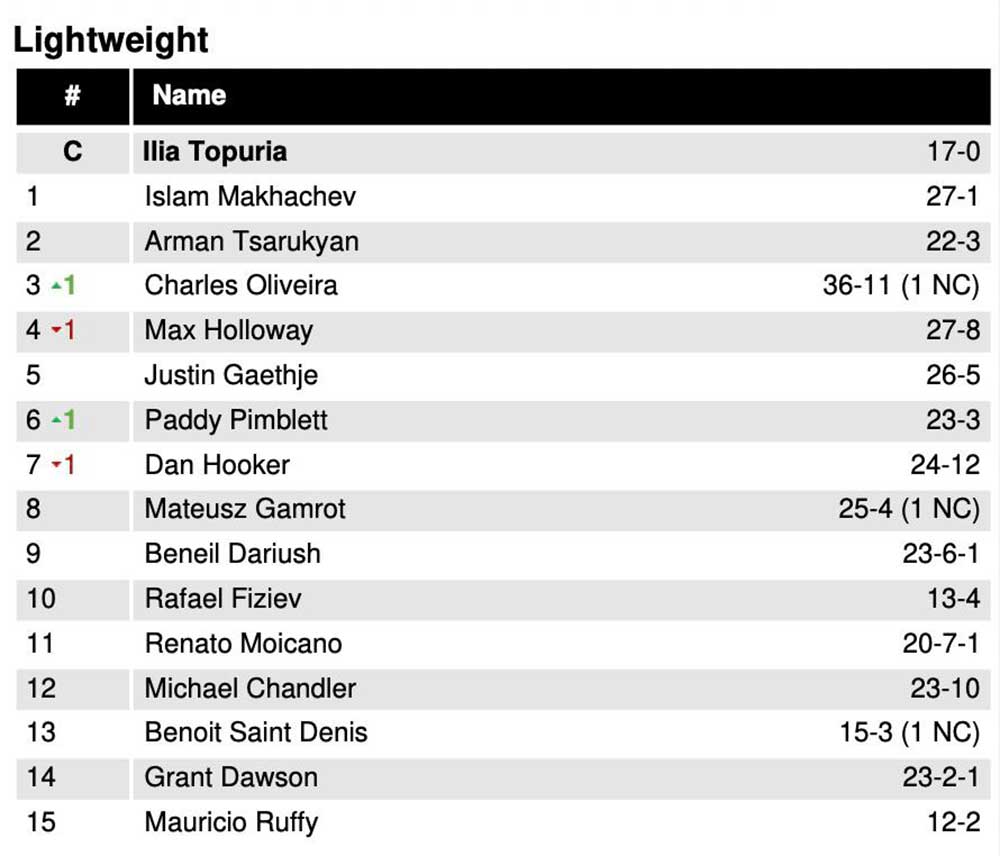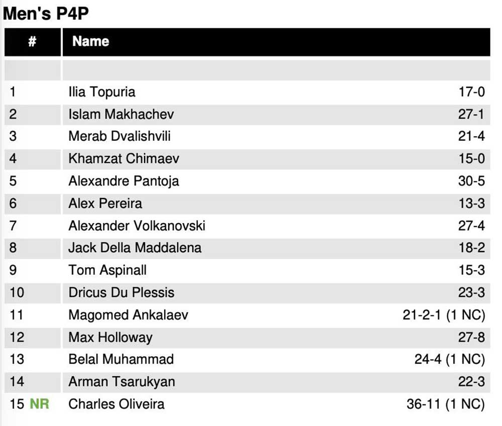 Одержав досрочную победу над Матеушем Гамротом на турнире UFC Fight Night 261 в Рио-де-Жанейро, Чарльз Оливейра вернулся в список лучших бойцов организации вне зависимости от весовой категории, заменив на 15-й позиции Шавката Рахмонова.