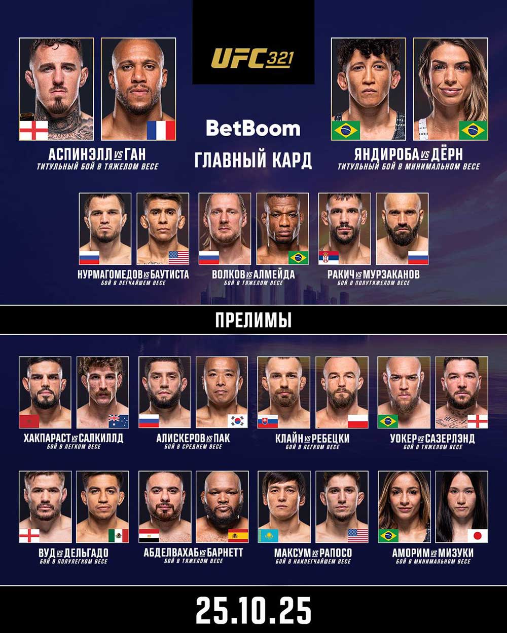 25 октября в 17:00 по московскому времени на арене «Этихад» в Абу-Даби стартует номерной турнир UFC 321, в главном событии которого британец Том Аспиналл выйдет на защиту чемпионского пояса в тяжёлом весе против француза Сирила Гана.