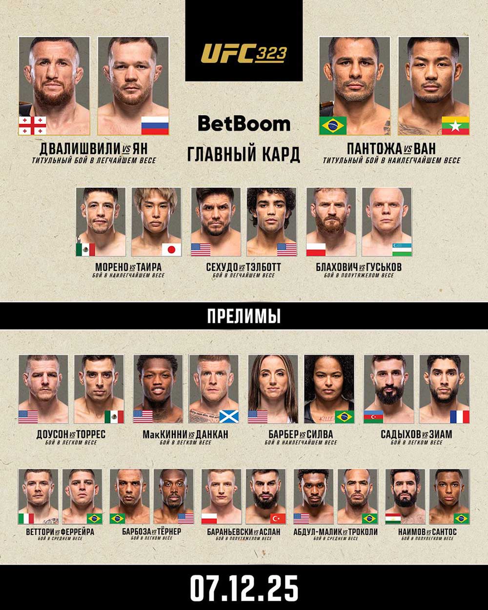 7 декабря в 2:00 по московскому времени на арене «Ти-Мобайл» в Лас-Вегасе стартует номерной турнир UFC 323, в главном событии которого действующий чемпион в легчайшем весе, Мераб Двалишвили, в поединке против Петра Яна попытается установить рекорд организации по наибольшему количеству защит титула за календарный год.