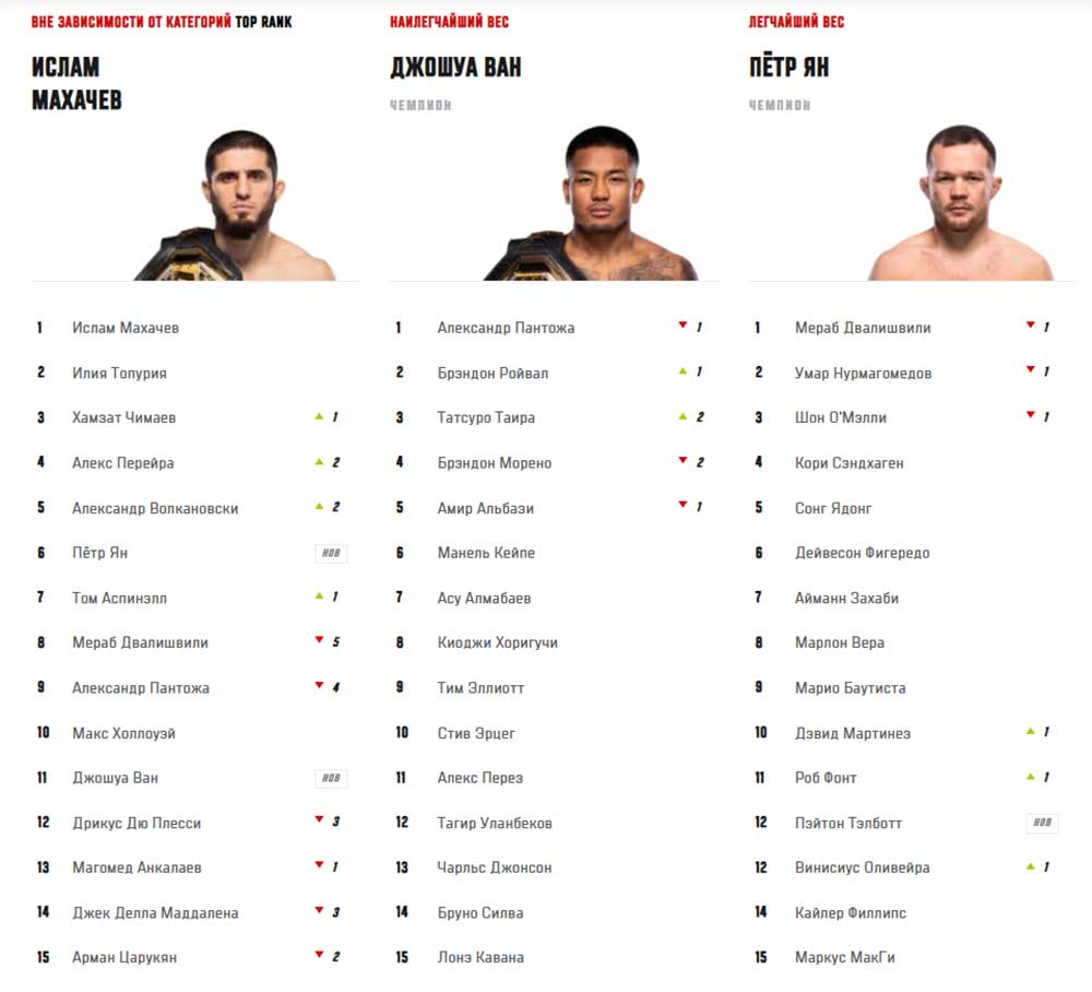 Одержав победу над Мерабом Двалишвили на UFC 323 в Лас-Вегасе, россиянин Пётр Ян вошёл в список лучших бойцов организации вне зависимости от весовой категории, заняв в нём шестую позицию.