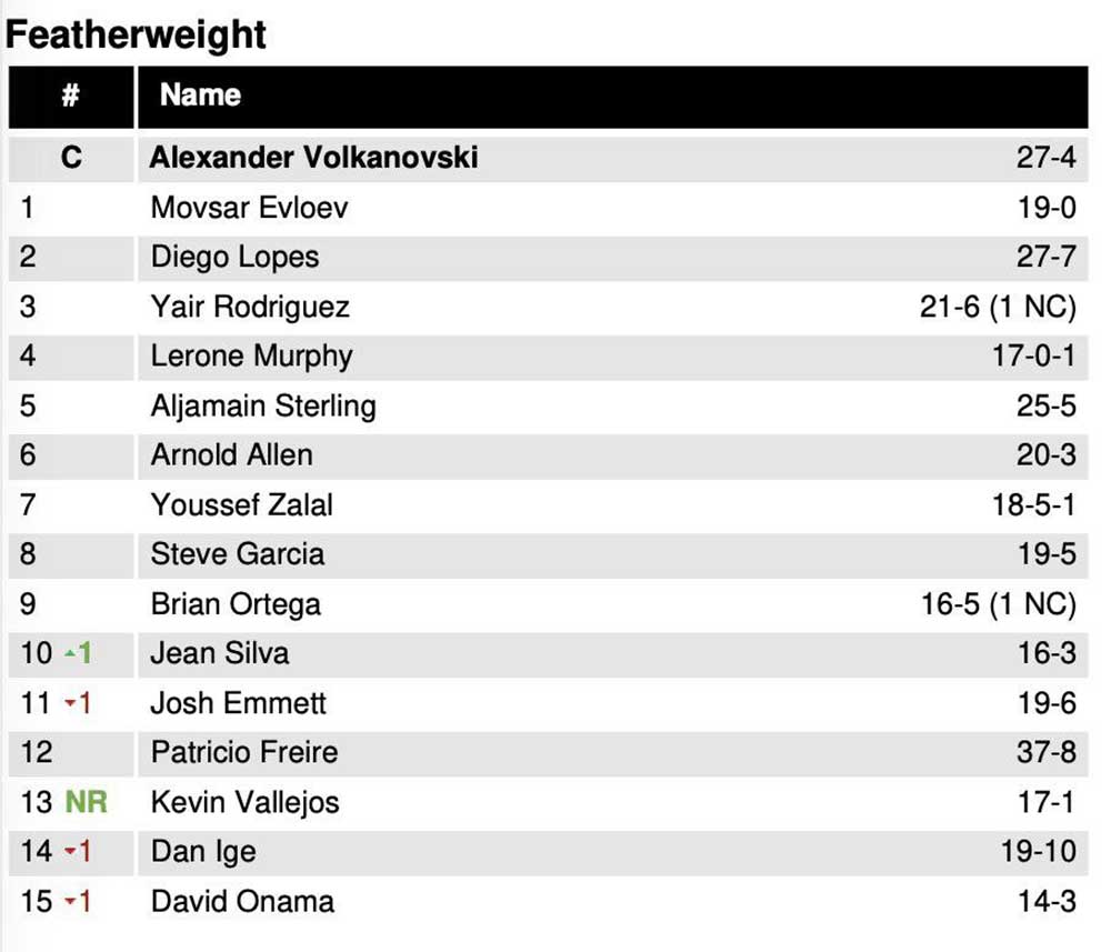Кевин Вальехос, в минувшие выходные нокаутировавший Гигу Чикадзе, вошёл в топ-15 рейтинга полулегковесов организации, разместившись на тринадцатой позиции в списке, а грузинский боец выбыл из числа лучших бойцов дивизиона.