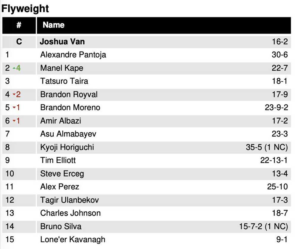 Существенно улучшил своё положение уроженец Анголы Манель Капе, который в главном событии турнира UFC on ESPN 73 нокаутировал Брэндона Ройвала и поднялся с шестой на вторую строчку в рейтинге наилегчайшего дивизиона. Американец потерял две позиции и оказался на четвёртом месте в топовой десятке.