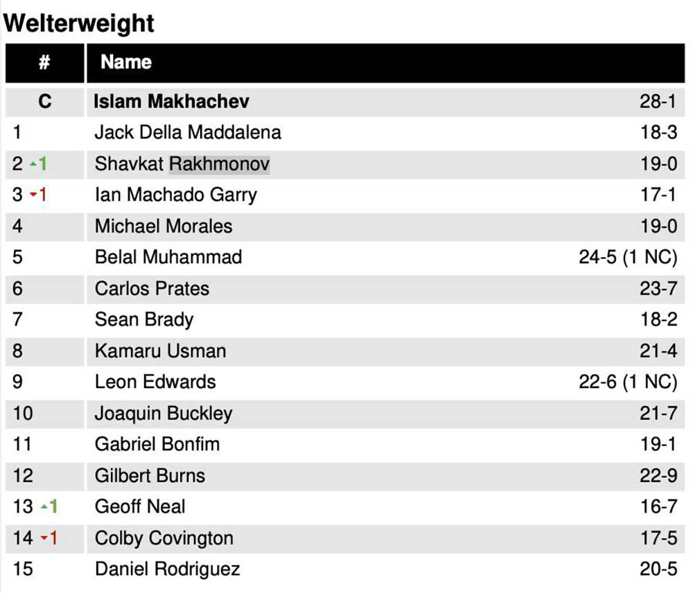 Непобеждённый казахстанский боец Шавкат Рахмонов, в текущем году ни разу не выходивший в октагон, поднялся на одну позицию и занял вторую строчку в рейтинге полусредневесов UFC, сместив с неё ирландца Йена Мачадо Гэрри, которого победил единогласным решением судей двенадцать месяцев назад.
