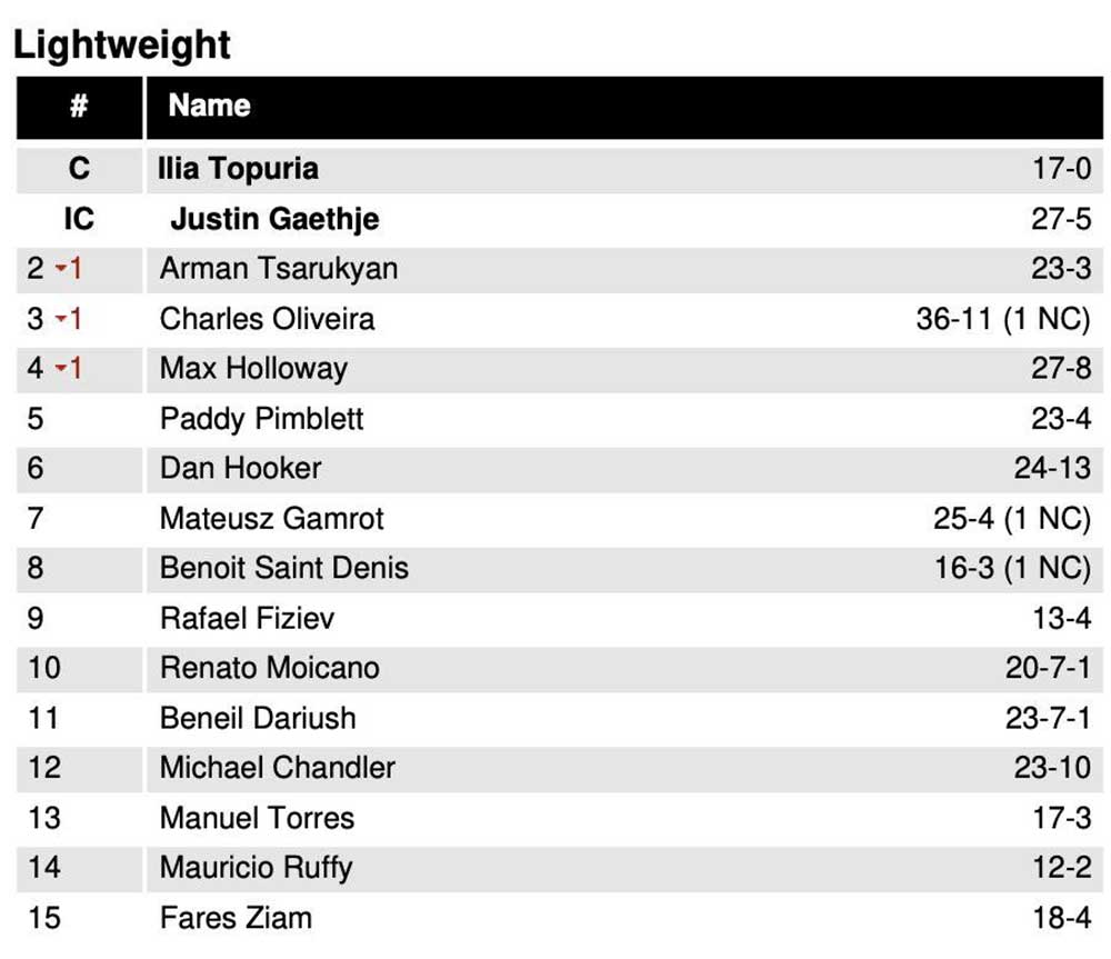 Джастин Гэйтжи, завоевавший временный чемпионский пояс UFC в лёгком весе в противостоянии с Пэдди Пимблеттом, поднялся на три позиции в рейтинге дивизиона, сместив с первой строчки россиянина Армана Царукяна, а британец, уступивший американцу единогласным судейским решением, остался на пятом месте в топовой десятке.
