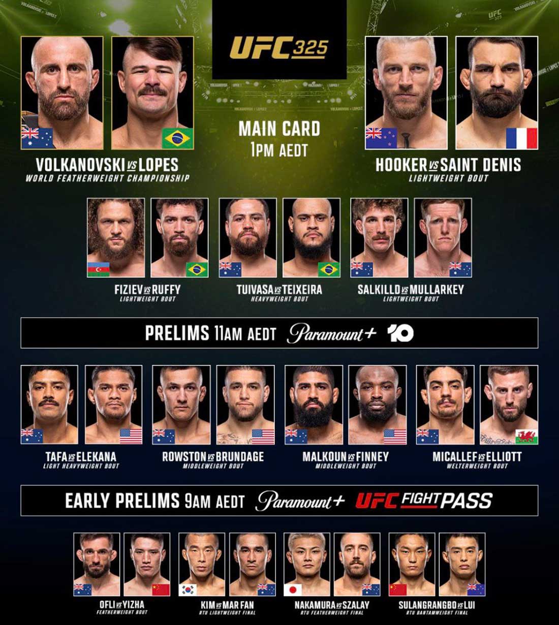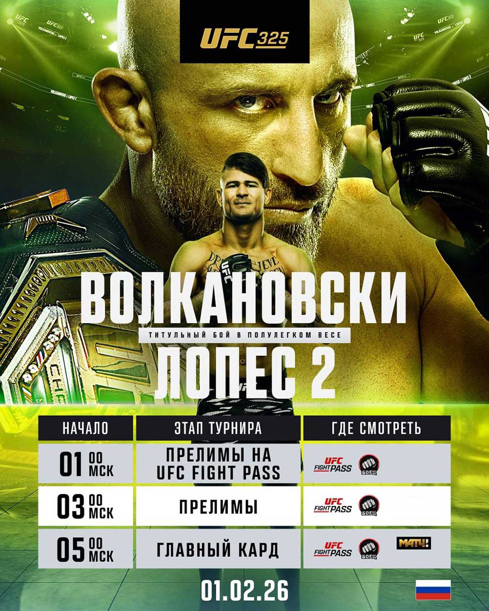 1 февраля в 1:00 по московскому времени в Сиднее стартует турнир UFC 325, в главном событии которого действующий чемпион лиги в полулёгком весе, Александр Волкановски, выйдет на защиту титула против Диего Лопеса, занимающего вторую строчку в рейтинге дивизиона.