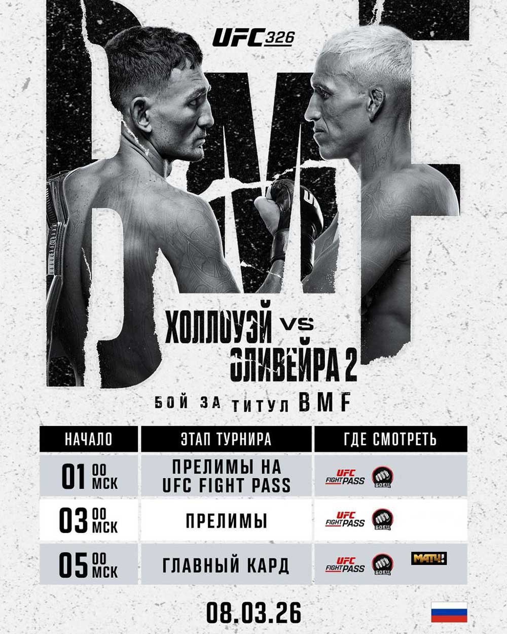 8 марта в 1:30 по московскому времени в Лас-Вегасе стартует турнир UFC 326, главным событием которого станет бой в лёгком весе между обладателем титула BMF, Максом Холловэем, и Чарльзом Оливейрой.