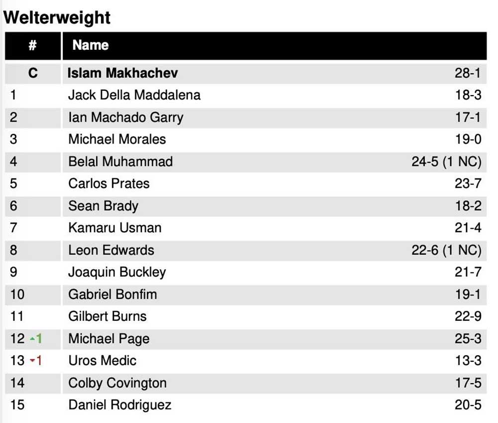 Британец Майкл Пейдж, показавший не лучшее своё выступление в противостоянии с соотечественником Сэмом Паттерсоном, поднялся на одну строчку и занял двенадцатое место в рейтинге полусредневесов, сместив с данной позиции Уроша Медича.