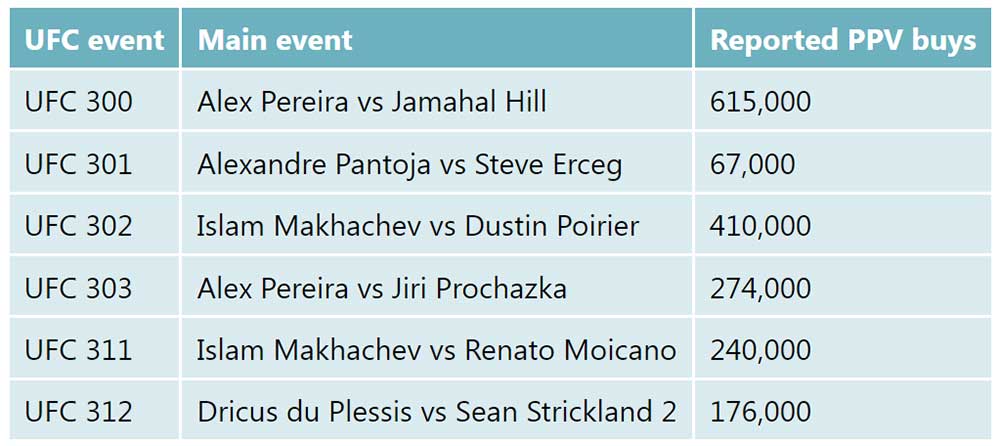 Самым прибыльным стал турнир UFC 300, который возглавил бой между Алексом Перейрой и Джамалом Хиллом, продавший 615 тысяч трансляций при цене в 79.99 долларов. Следующий бой бразильца, который он провёл на UFC 303 против Иржи Прохазки, показал более скромный результат в 274 тысячи PPV.