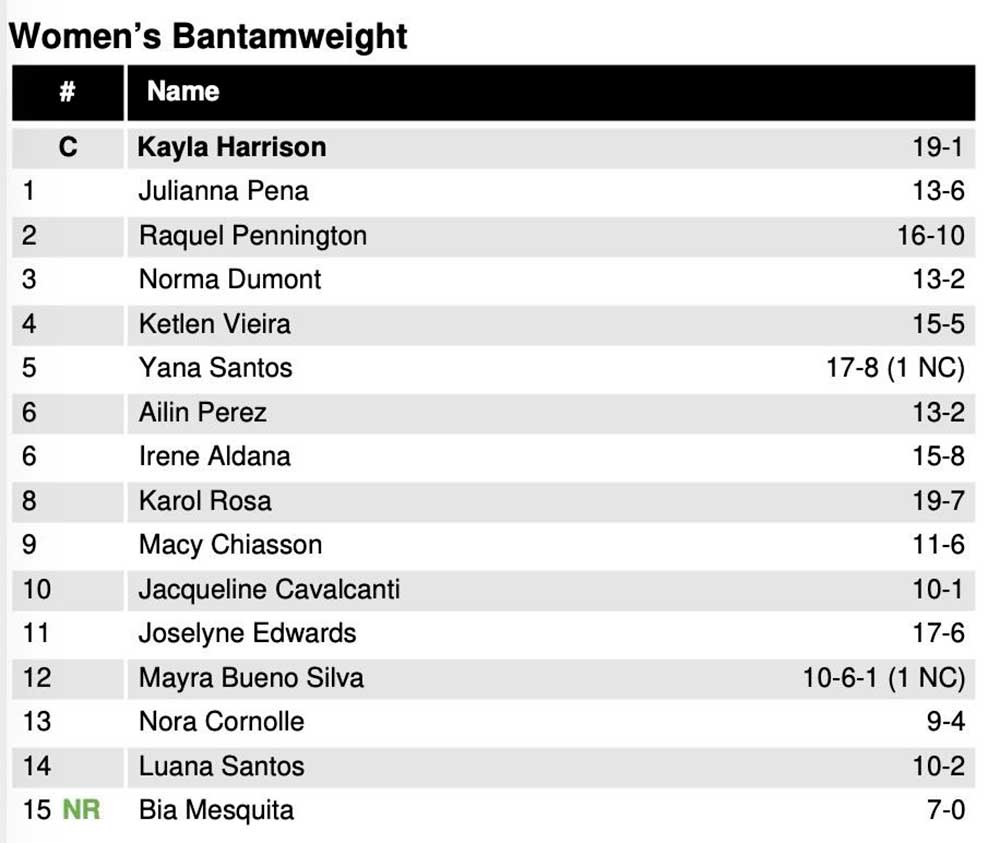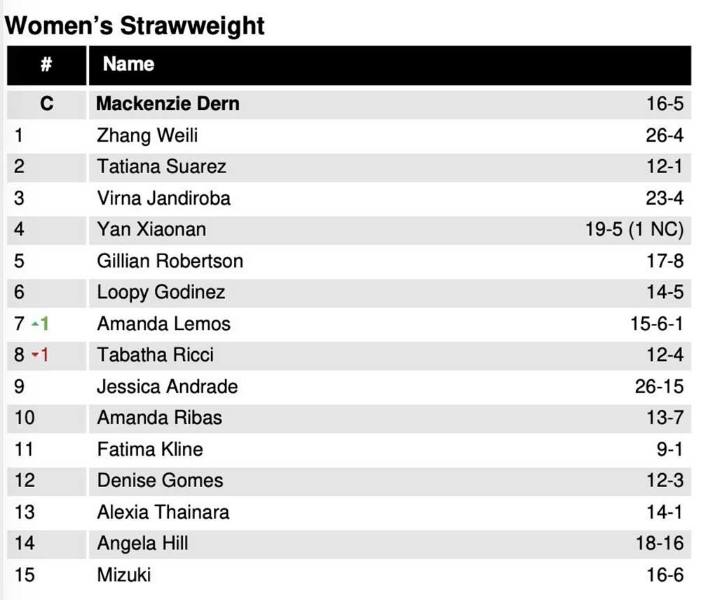 Бразильянка Вирна Яндироба, во втором по значимости событии турнира победившая единогласным решением судей свою соотечественницу Табату Риччи, осталась на третьем месте в рейтинге первого наилегчайшего веса, а её соперница опустилась с седьмой на восьмую строчку, поменявшись местами с Амандой Лемос.