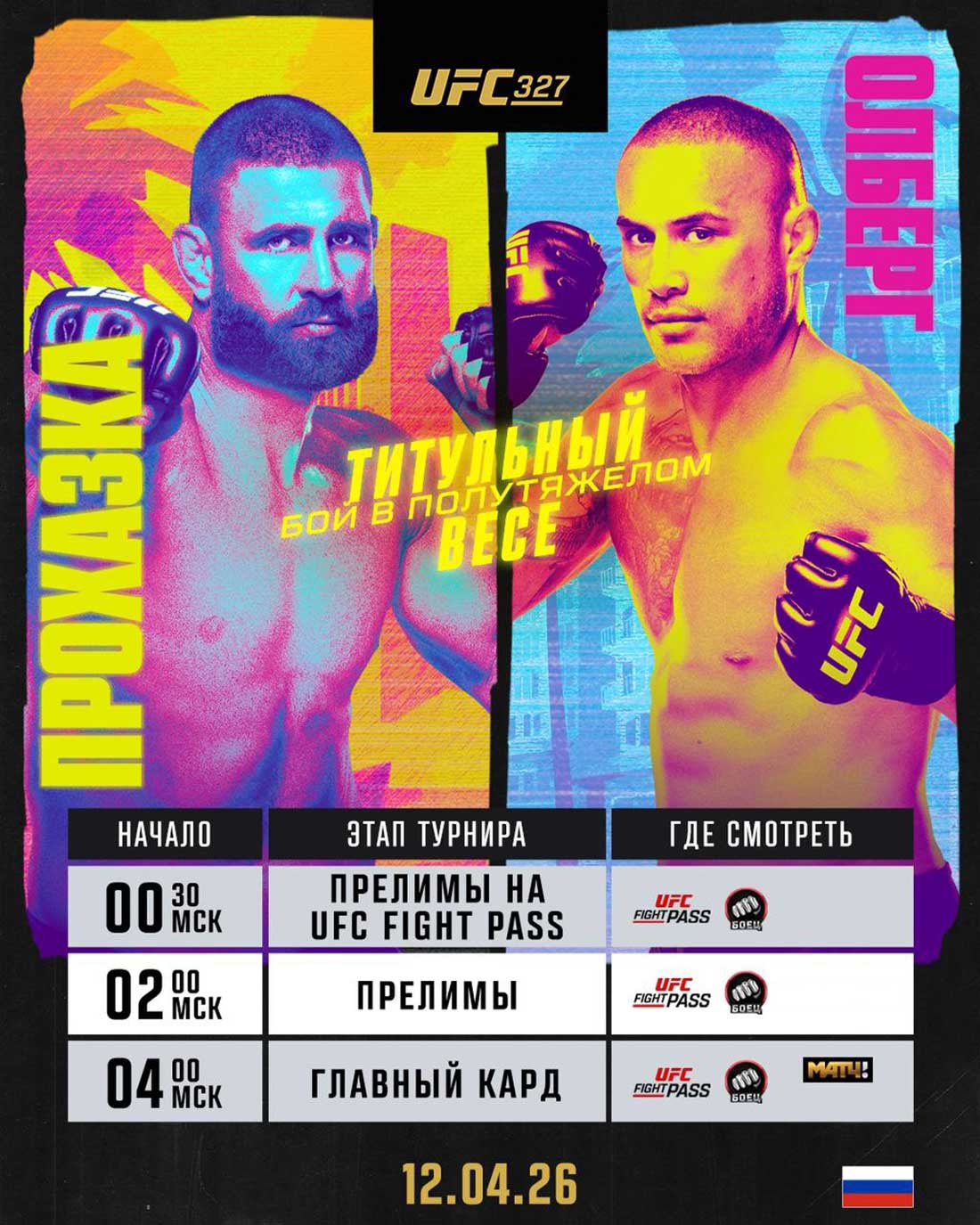 12 апреля в 0:30 по московскому времени на арене «Касея-Центр» в Майами стартует номерной турнир UFC 327, в главном событии которого чех Иржи Прохазка и новозеландец Карлос Улберг разыграют вакантный чемпионский пояс в полутяжёлом весе, освобождённый бразильцем Алексом Перейрой.
