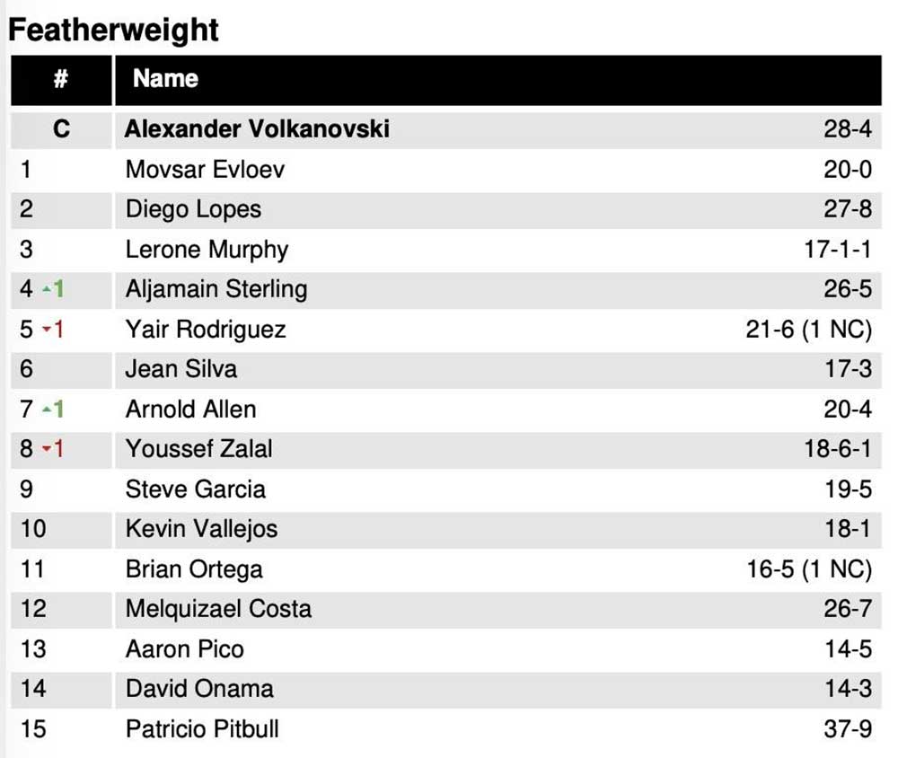 Уверенно победив Юссефа Залала единогласным судейским решением на турнире UFC Fight Night 274 в Лас-Вегасе, Алджамэйн Стерлинг поднялся на четвёртую строчку рейтинга полулегковесов организации, сместив с данной позиции Яира Родригеса.