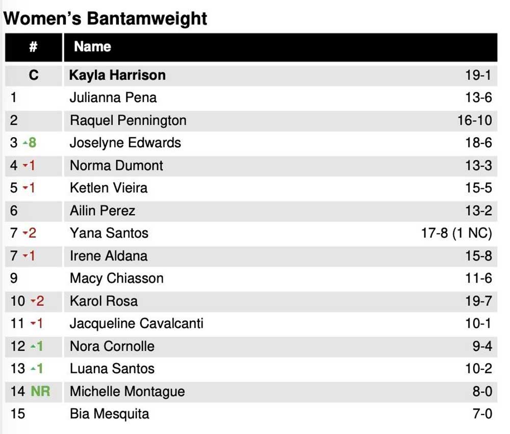 Жоселин Эдвардс, во втором по значимости событии мероприятия неожиданно победившая единогласным решением судей Норму Дюмонт, переместилась сразу на восемь строчек в женском легчайшем дивизионе, замкнув топовую тройку, а её соперница опустилась на четвёртое место.